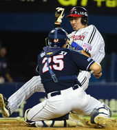 2014.09.05 19: 24홈 쇄도하는 정성훈,'뚫고갈 틈이 없네'