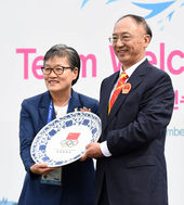 2014.09.18 11: 40중국 선수단 단장과 기념품 교환하는 이에리사 선수촌장