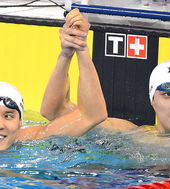 2014.09.23 20: 27쑨양 팔 들어보이는 박태환,'쑨양! 네가 최고야'