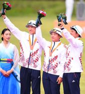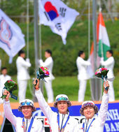 2014.09.27 12: 14금메달 女 컴파운드 양궁대표팀,'자랑스러운 태극기 앞에'