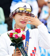 시상대에서 눈물 훔치는 정다소미