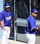류현진 불펜피칭 지켜보는 허니컷 코치