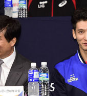2014.10.15 14: 50대한항공 김종민-신영수,'신경전 보단 미소 띄는 현장'