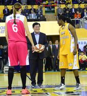 여자농구 개막전 시투하는 최경환 WKBL 명예총재
