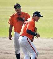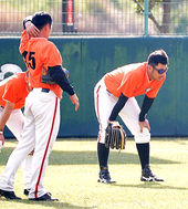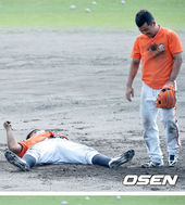 [연속사진]펑고 훈련에 지친 김태균,'김데굴로 변신'