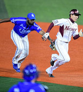 런다운 플레이로 아웃되는 넥센 대주자 유재신