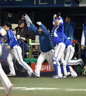 2014.11.07 22: 04박한이의 역전 투런포에 기뻐하는 삼성,'3차전 승리가 보인다'