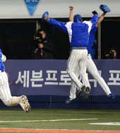 2014.11.07 22: 07기뻐하는 김재걸 코치-박한이,'9회 짜릿한 역전 투런'