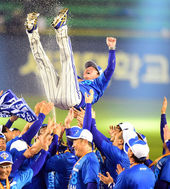 2014.11.11 22: 38류중일 감독,'샴페인 세례와 함께 헹가래!'