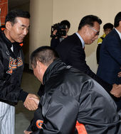2014.11.13 11: 56선수들과 인사 나누는 롯데 이종운 감독-이윤원 단장-이창원 대표이사