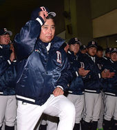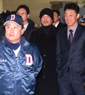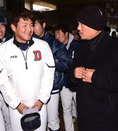 2014.11.30 12: 54이상훈 코치의 입장에 미소 짓는 두산 선수들