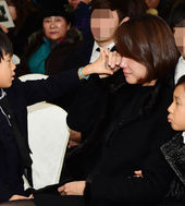 2014.12.14 15: 37눈물 닦는 윤원희,'엄마 위로하는 아들과 딸'