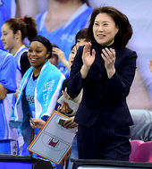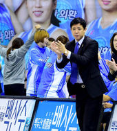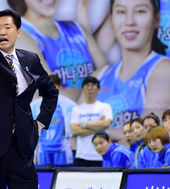 2014.12.15 19: 46박수치는 하나외환 정선민 코치,'홈 첫승을 향해~'
