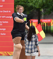 2015.01.13 14: 27레드카드를 든 심판 복장의 키다리 광대