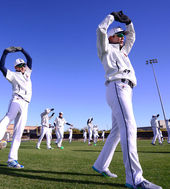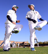 2015.01.26 06: 59밝은 표정으로 스트레칭 하는 유희관과 김현수
