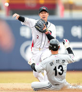 2015.03.17 15: 03한윤섭,'1루로 힘차게 송구해 보지만'