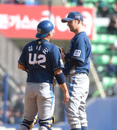 2015.03.28 15: 38이야기 나누는 김태군-찰리,'위기 넘기자'
