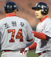 2015.04.05 18: 09박진만,'최정 쓰담쓰담'