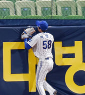 2015.04.08 20: 05박해민,'전력 질주로 잡아낸 후 펜스에 쿵!'
