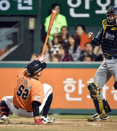 2015.04.18 19: 53머리쪽 공에 깜짝 놀라 넘어지는 김태균