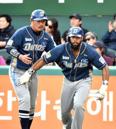 2015.04.18 18: 39지석훈의 적시타때 홈을 밟은 이호준과 테임즈