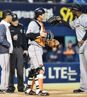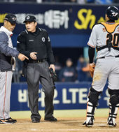 2015.04.21 20: 25김성근 감독-정범모-유먼,'구심에게 항의'