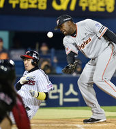 볼 놓치는 유먼, 정범모 실책 틈타 홈에 쇄도해 세이프되는 정성훈!
