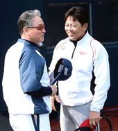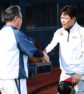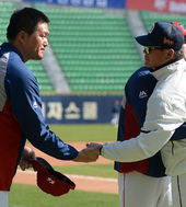 2015.04.24 16: 19최희섭,'박철우 코치 손 꼭 잡으며 훈훈한 미소'