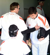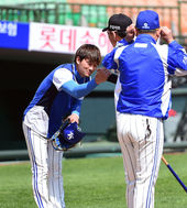 2015.04.25 15: 26장난기 발동 강민호,'신인 포수 혹독하게(?) 길들이기'