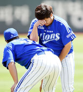 박석민,'이승엽 허리에 팔꿈치로 꾹'