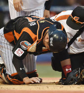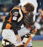2015.05.08 19: 00강민호,'파울타구를 급소에 맞다니'