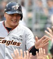 2015.08.04 19: 14싱글벙글 김태균,'발로 만든 득점이라고~'