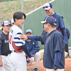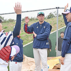 2026.02.01 14: 47불펜투구 마친 쿄야마와 얘기하는 가네무라 코치와 김상진 코치