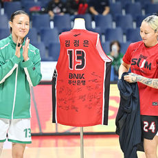 2026.02.07 13: 53은퇴 투어 하나은행 김정은, BNK 선수단 싸인 유니폼에 감사