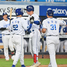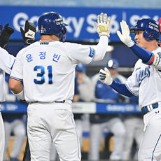 7-1 승리 하이파이브하는 삼성 선수들