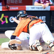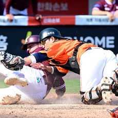 2026.03.28 15: 37브룩스 홈 쇄도 막아내는 한화 포수 최재훈의 태그