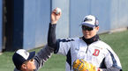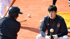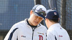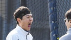 [OSEN=이천, 민경훈 기자] 7일 두산 베어스가 경기 이천시 백사면 두산베어스파크에서 2021 스프링캠프 훈련을 가졌다.오후 훈련에서 두산 정수빈이 타격훈련을 마친 후 유태현 트레이닝 코치를 향해 입을 크게 벌리고 있다./rumi@os