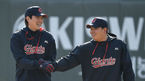 [OSEN=이천, 민경훈 기자] 7일 두산 베어스가 경기 이천시 백사면 두산베어스파크에서 2021 스프링캠프 훈련을 가졌다.오후 훈련에서 두산 김주찬 코치와 두산 김재환이 즐겁게 얘기를 나누며 환하게 웃고 있다./rumi@osen.co.kr