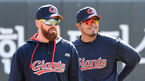 [OSEN=이천, 민경훈 기자] 7일 두산 베어스가 경기 이천시 백사면 두산베어스파크에서 2021 스프링캠프 훈련을 가졌다.오후 훈련에서 두산 김주찬 코치와 두산 김재환이 즐겁게 얘기를 나누며 환하게 웃고 있다./rumi@osen.co.kr