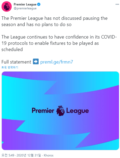 EPL 사무국은 "우리는 리그가 일정대로 진행할 수 있다고 생각한다. 우리의 코로나 19 프로토콜을 계속 믿을 것이다. 영국 정부도 우리의 선택을 지원한다"라고 강조했다.