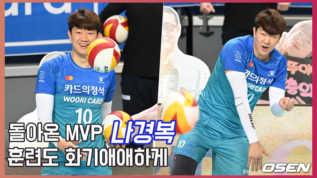 경기 전 우리카드 나경복이 화기애애한 분위기 속에서 훈련을 하고 있다./ rumi@osen.co.kr