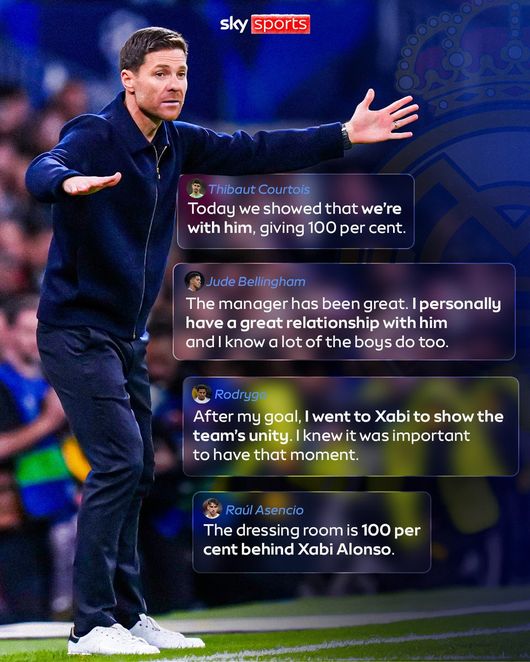 하지만 경기 후 레알 마드리드 선수들은 알론소 감독을 공개 지지했다. 주드 벨링엄은 "우리는 감독님을 전적으로 지지한다. 그는 훌륭한 사람이다. 난 그와 매우 좋은 관계를 유지하고 있고, 많은 팀원들도 그렇다"라고 강조했다. 그는 출전시간이 줄어들며 알론소 감독과 사이가 틀어졌다는 소문이 돌고 있지만, 여기에 직접 선을 그은 것.