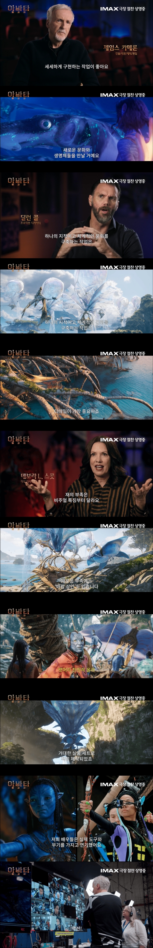이어 ‘바람 상인’에 대해서는 “떠돌며 살아가는 유목민이라는 설정 아래, 바람에 흩어진 구름 문양을 의상 장식에 반영하였다”고 밝히며 단순히 새로운 부족의 등장이 아닌 부족들의 가치관과 삶의 방식을 온전히 투영하여 캐릭터들의 밀도를 높였음을 전했다. 여기에 이들이 타고 다니는 곤돌라의 갑판을 거대한 실물 세트로 제작한 비하인드가 함께 공개돼, CG에 의존하기보다 실제 공간에서부터 세계를 구축해온 제임스 카메론 사단 특유의 제작 방식을 확인할 수 있다.