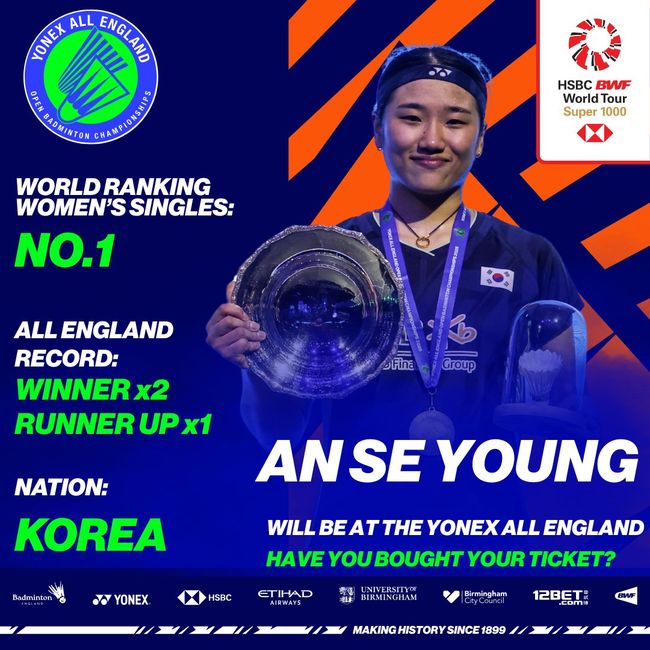 이어 "지난해 요넥스 전영 오픈에서 자신의 두 번째 우승을 차지한 안세영이 오는 3월 버밍엄에서 열리는 대회에서 3관왕에 도전할 수 있을까? 놓치지 마라. 지금 바로 티켓을 구매하라!"라고 강조했다.