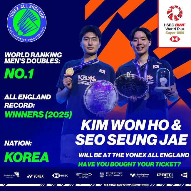 전영 오픈은 "김원호와 서승재가 요넥스 전영 오픈에 출전한다! 기록적인 한 해를 보낸 2025년 남자 복식 챔피언이 3월에 버밍엄으로 돌아와 타이틀 방어에 나선다!"라며 "놓치지 말라"라고 강조했다.