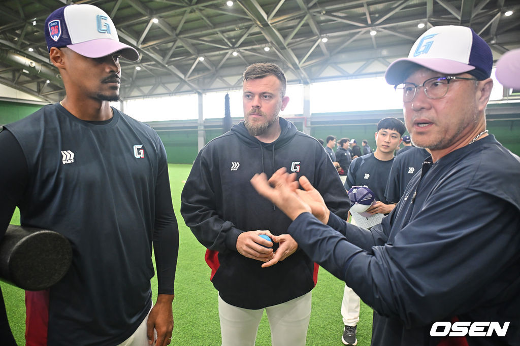 롯데 새 외국인 투수 로드리게스, 비슬리가 김상진 코치와 얘기하고 있다. 2026.01.31 / foto0307@osen.co.kr