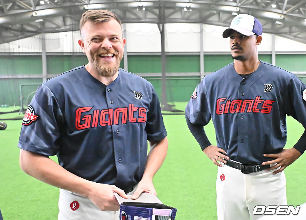 롯데 새 외국인 투수 비슬리, 로드리게스(왼쪽부터)가 김상진 코치와 얘기하고 있다. 2026.01.31 / foto0307@osen.co.kr