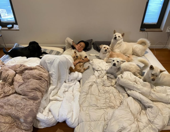 공개된 사진 속에는 방바닥에 펼쳐진 이불과 매트 위에서 반려견들이 제각각 누워 있는 모습이 담겼다. 또 다른 사진에서는 이효리가 이불 위에 누워 반려견을 품에 안은 채 여유로운 시간을 보내고 있다.
