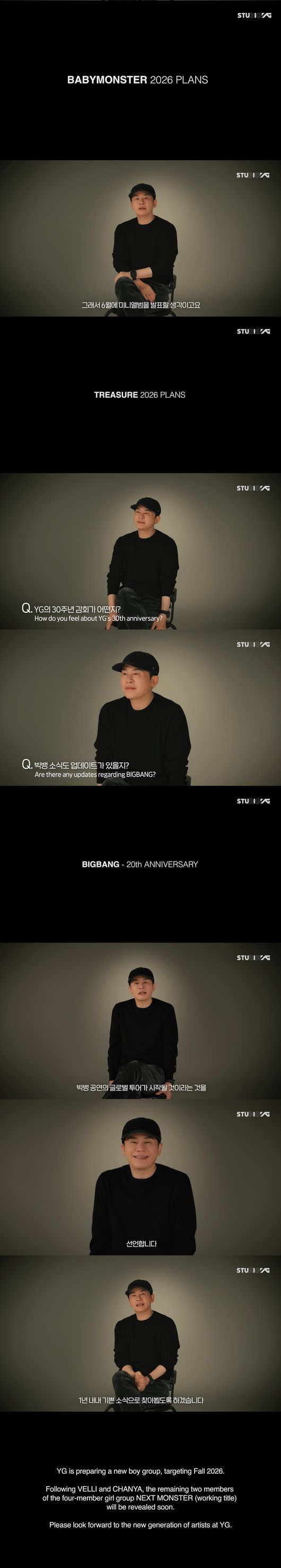 YG엔터테인먼트는 4일 공식 블로그에 '2026 YG PLAN | YG ANNOUNCEMENT'를 게재했다. 지난해 8월 이후 약 6개월 만에 양현석 총괄 프로듀서가 인터뷰에 나서 올해 예정된 YG의 굵직한 소식들을 직접 전한 것.