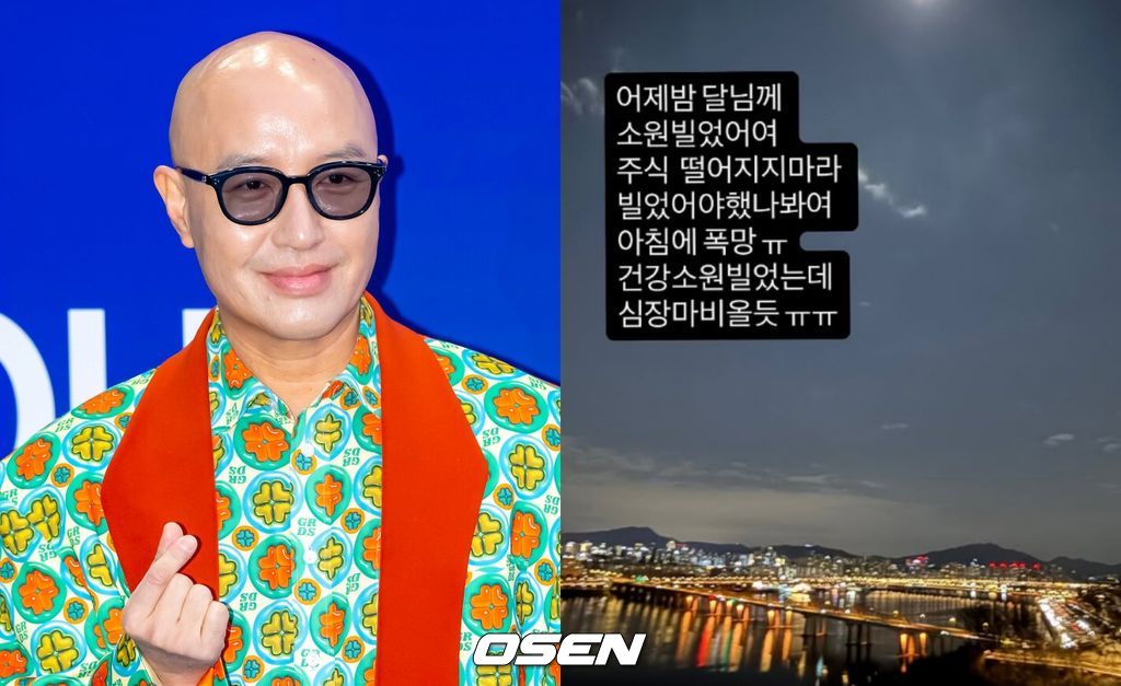 4일 홍석천은 자신의 소셜 계정에 "어젯밤 달님께 소원 빌었어요"라며 "주식 떨어지지마라 빌었어야 했나봐요"라고 글을 올렸다.